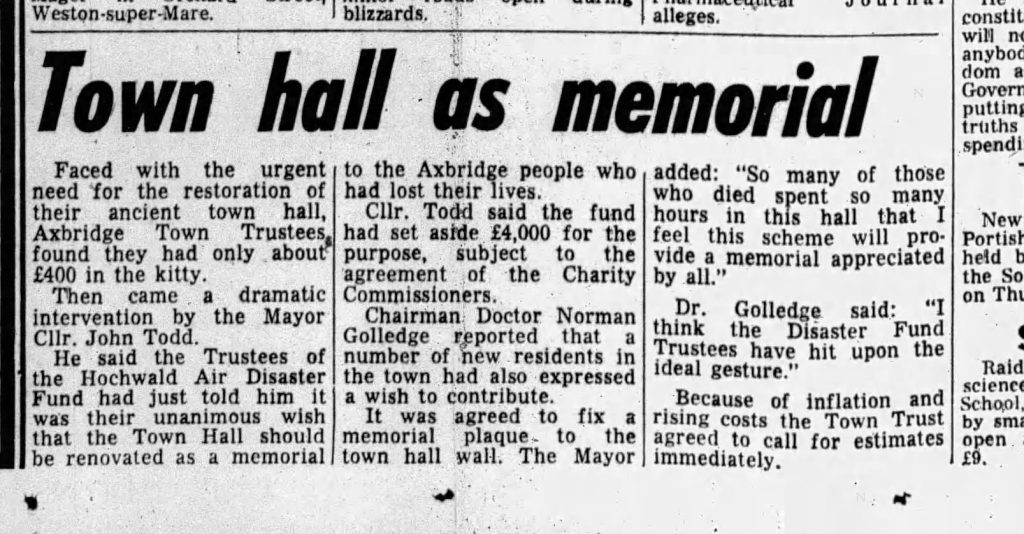 Bristol Evening Post Tue Jan 7th 1975 – Faced with the urgent need for the restoration of their ancient town hall, hall, Axbridge Town Trustees found they had only about £400 in the kitty. Then came a dramatic intervention by the Mayor Clir. John Todd. He said the Trustees of the Hochwald Air Disaster Fund had just told him it was their unanimous wish that the Town Hall should be renovated as a memorial to the Axbridge people who had lost their lives.
